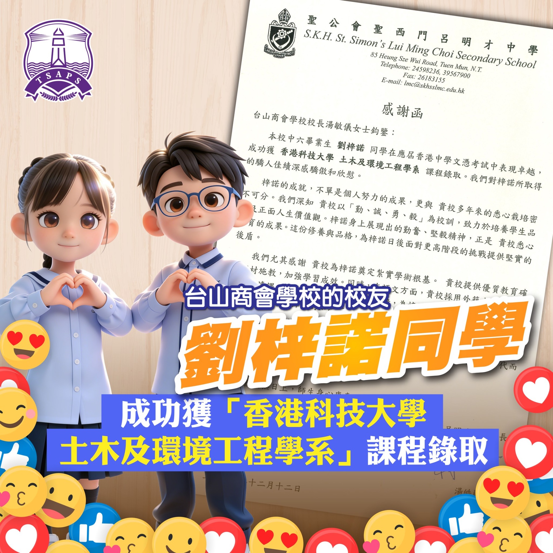 每次知道校友入讀大學的消息,都讓我們十分欣喜,彰顯了台山勤誠勇毅的精神,是學弟妹們的好榜樣,盼望他們在學習的道路上繼續努力,成就才得兼備的台山人。